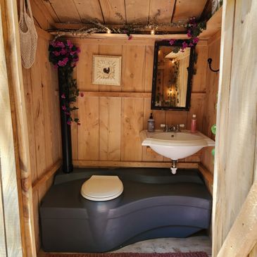 Here is where our main bathroom is located; a cute and modernized hand crafted "outhouse" with running water and all of the essentials.